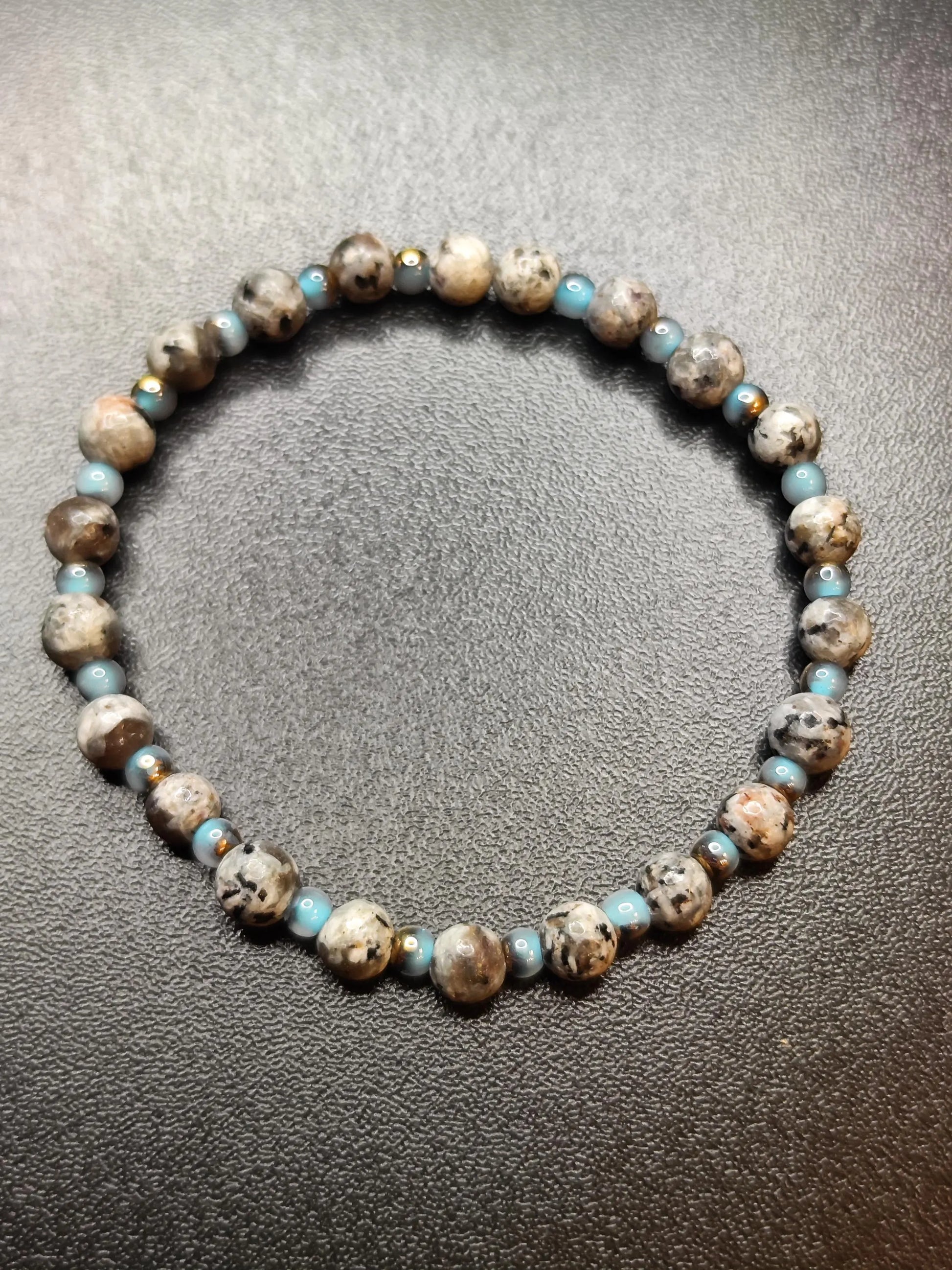 This handcrafted bracelet captivates with the unique look of its 6 mm Yooperlite gemstone beads, which shimmer in grey to black veining. Small blue glass bead spacers add pops of color and give the bracelet a modern touch.