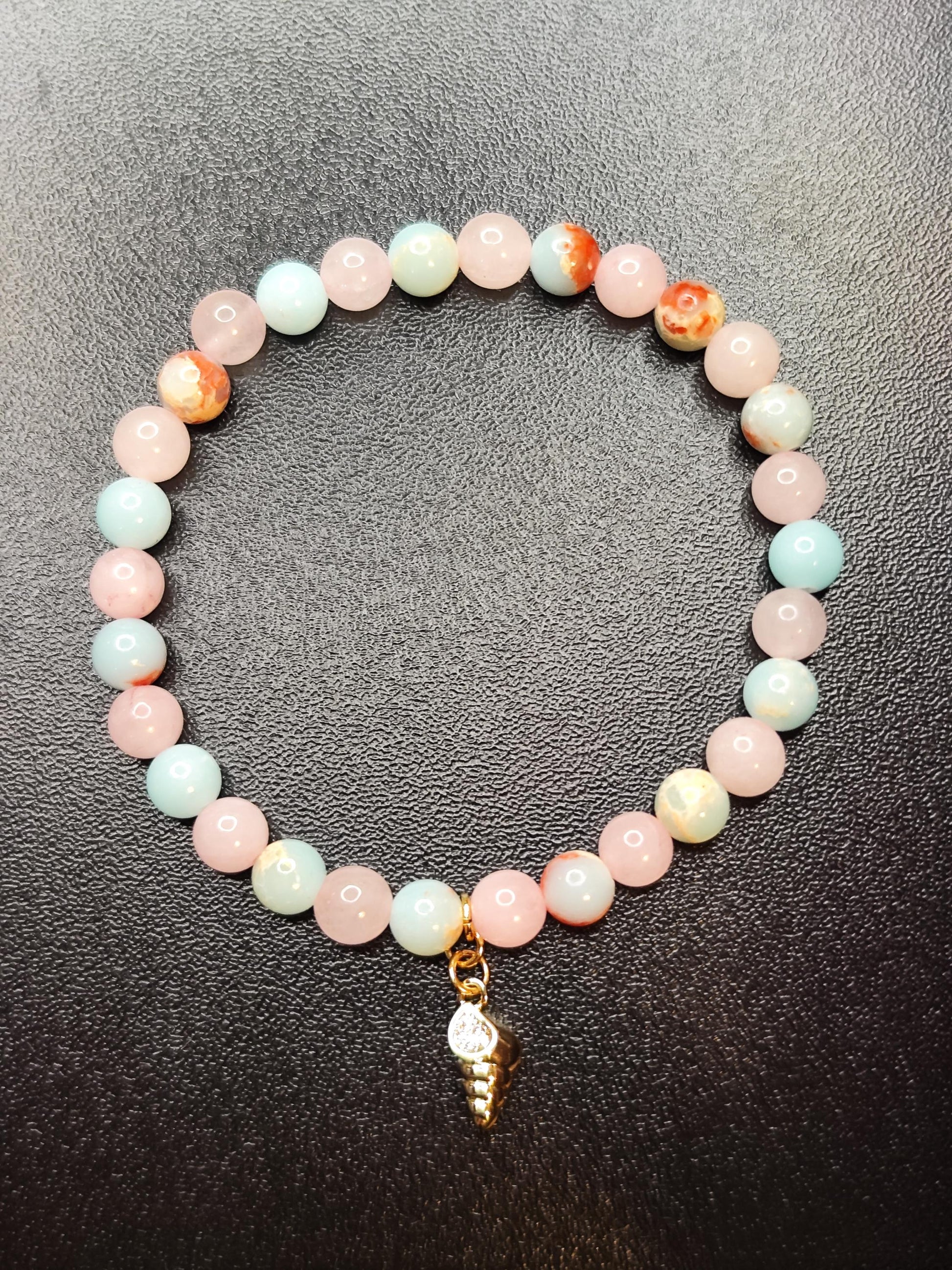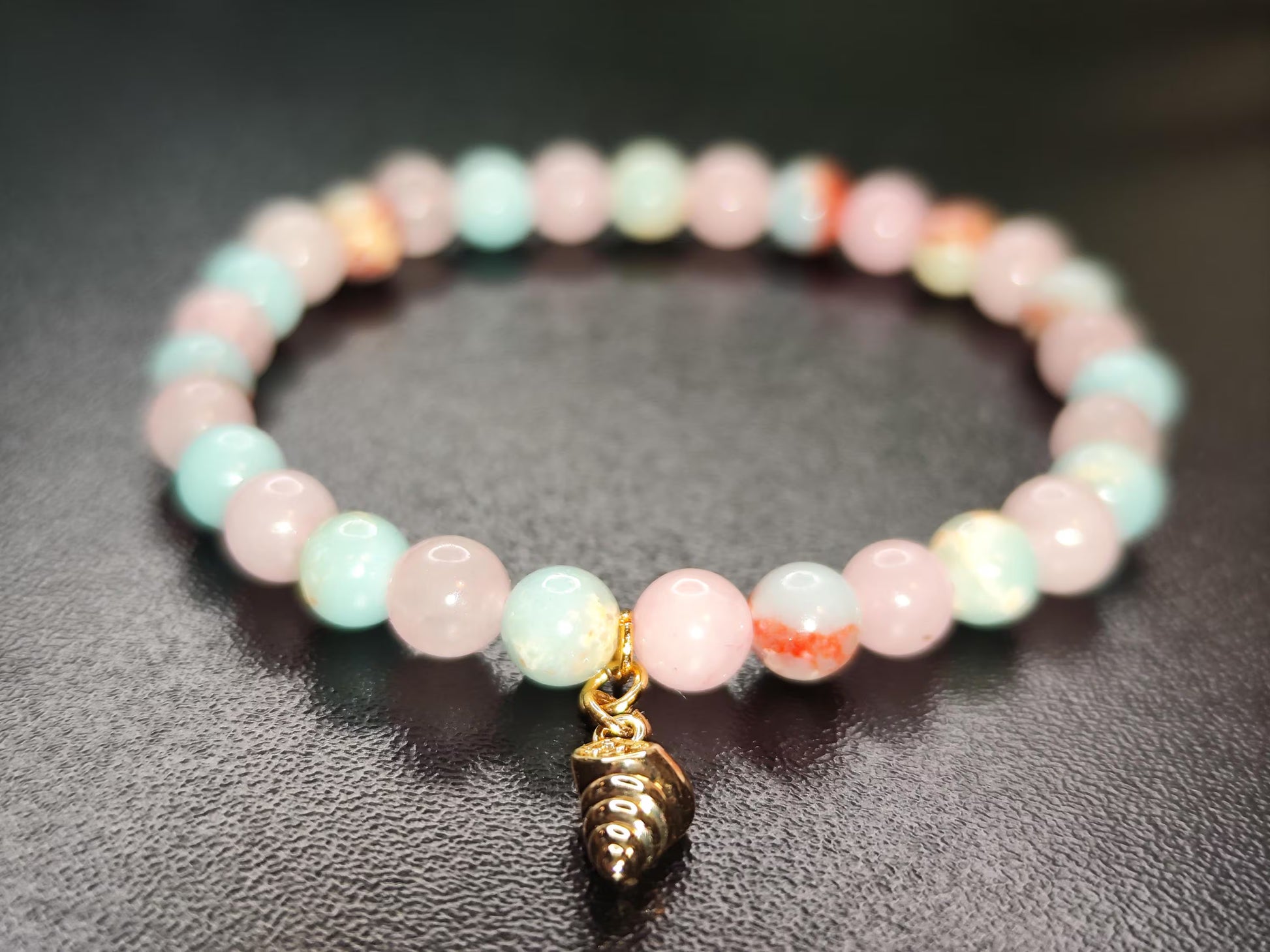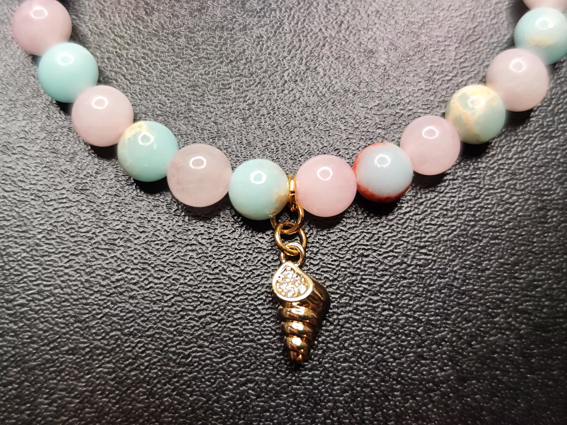 Verleihe deinem Look einen Hauch von Eleganz mit diesem liebevoll handgefertigten Armband aus natürlichen Rosenquarz- und Blue Snakeskin Jaspis-Perlen. Ein hochwertiger 18k vergoldeter Charm in Form einer zarten Schnecke verleiht dem Design einen verspielten Akzent.