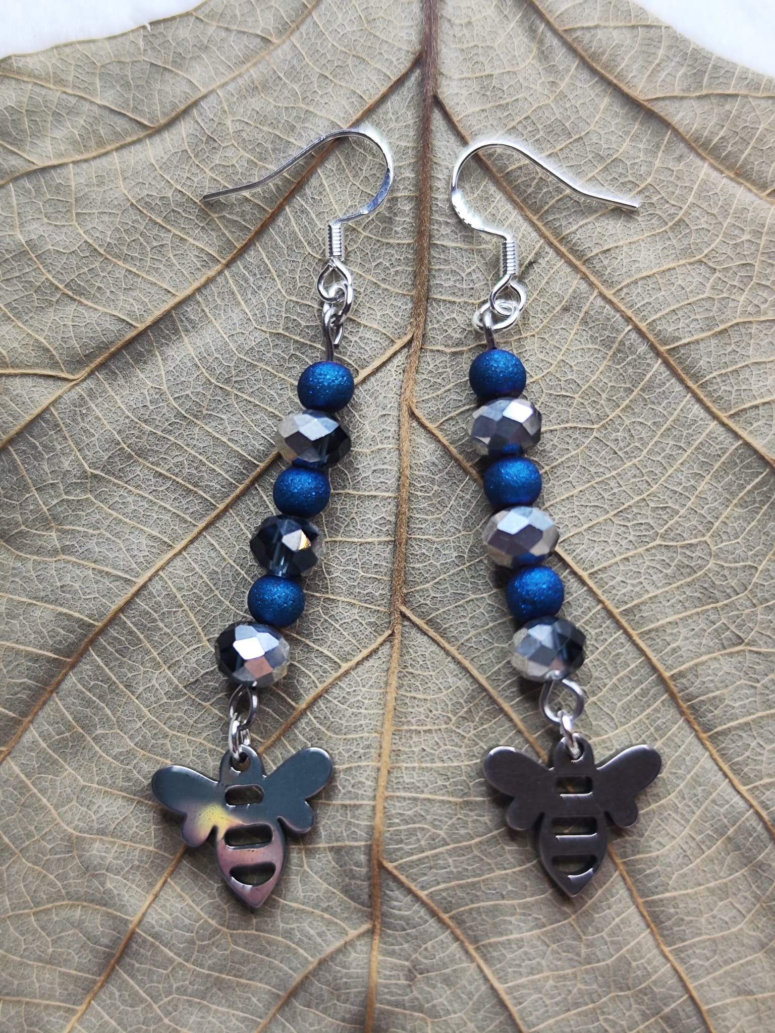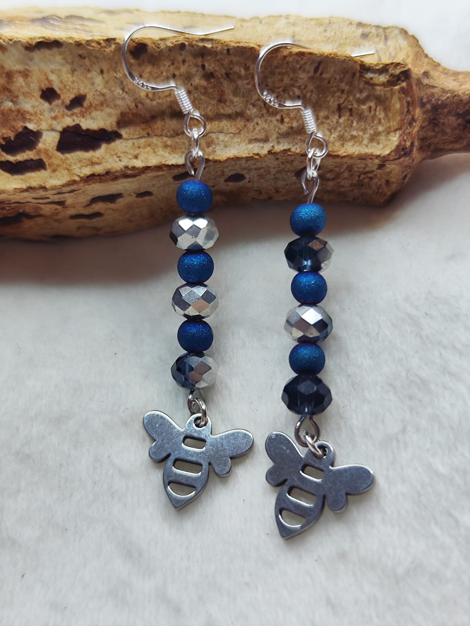 Bienen-Ohrringe mit blauen Frost-Perlen & Glasschliffperlen – Edelstahl Anhänger & Sterling-Silber-Ohrhaken