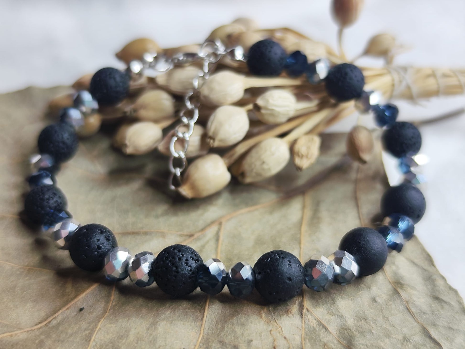 Die natürlichen Lavasteine sorgen für eine besondere Struktur, während die Glasschliffperlen das Licht in faszinierenden Facetten reflektieren.