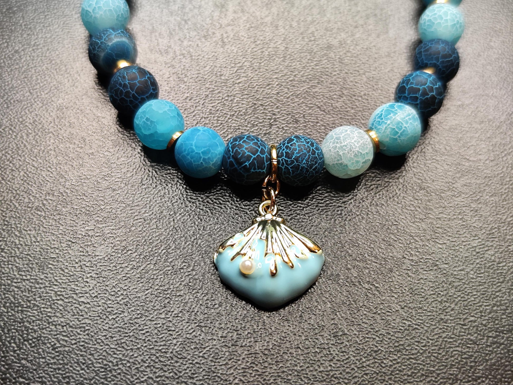 Ein edles, handgefertigtes Naturstein-Armband aus hell- und dunkelblauen Feuerdrachen-Achat-Perlen. Zwischen den Edelsteinen setzen feine 18k vergoldete Spacer-Scheiben goldene Akzente. Abgerundet wird das Design durch einen eleganten Muschel-Anhänger mit goldfarbenen Details, der dem Schmuckstück einen maritimen und sommerlichen Charakter verleiht.