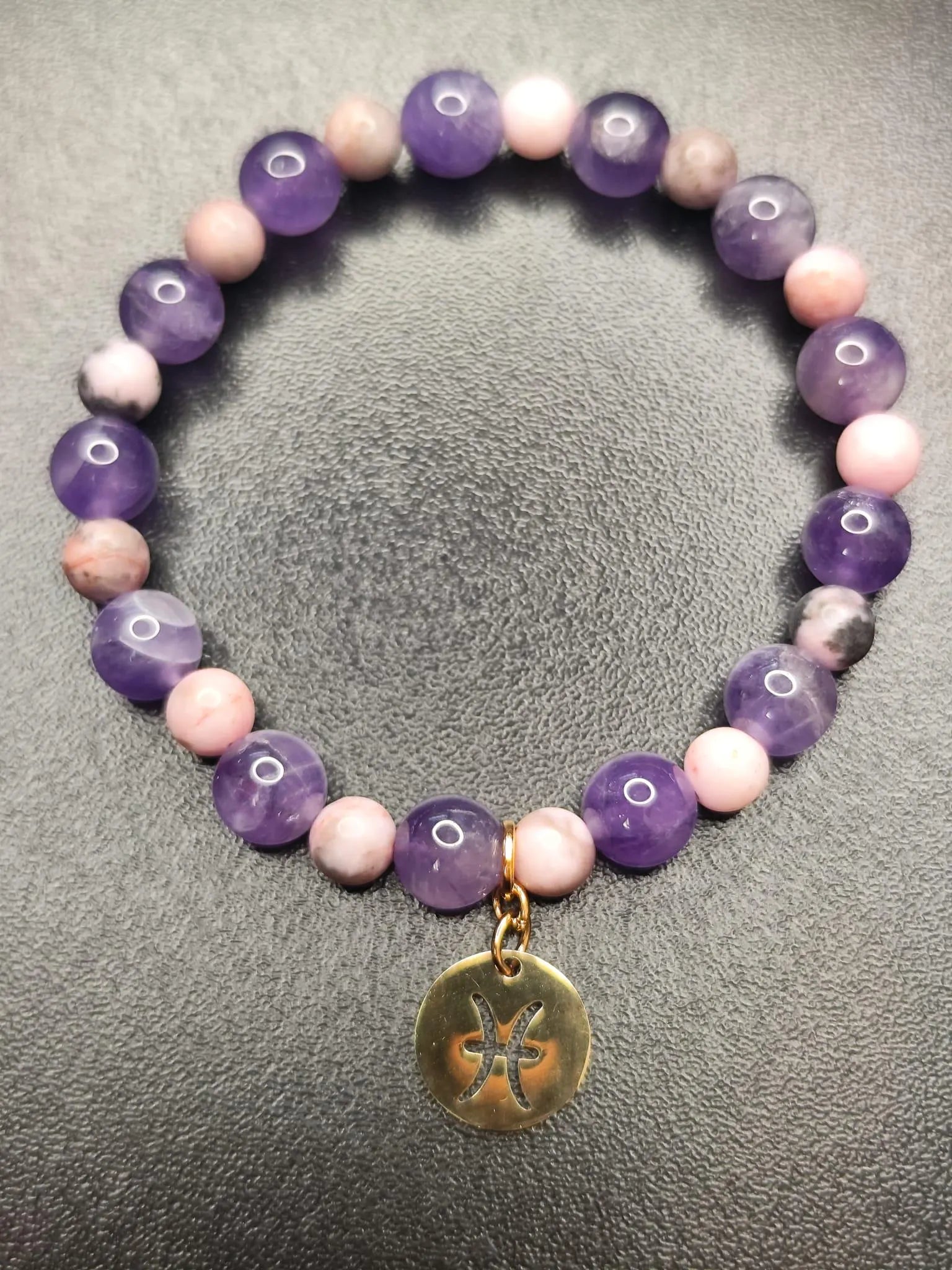Handgemachtes Amethyst & Zebra Jaspis Armband mit 18k vergoldetem Sternzeichen-Anhänger (Fische) – Edelstein Schmuck