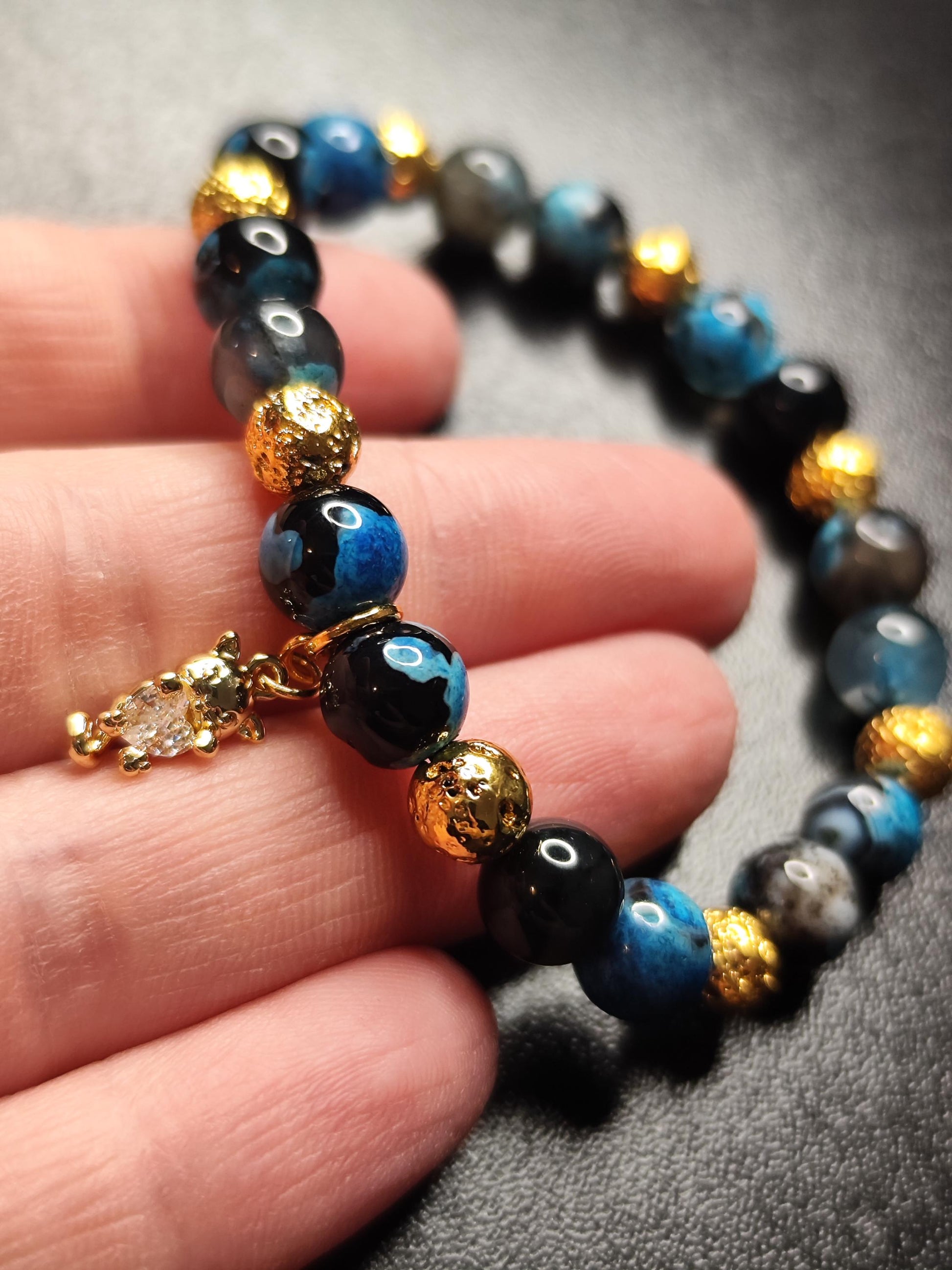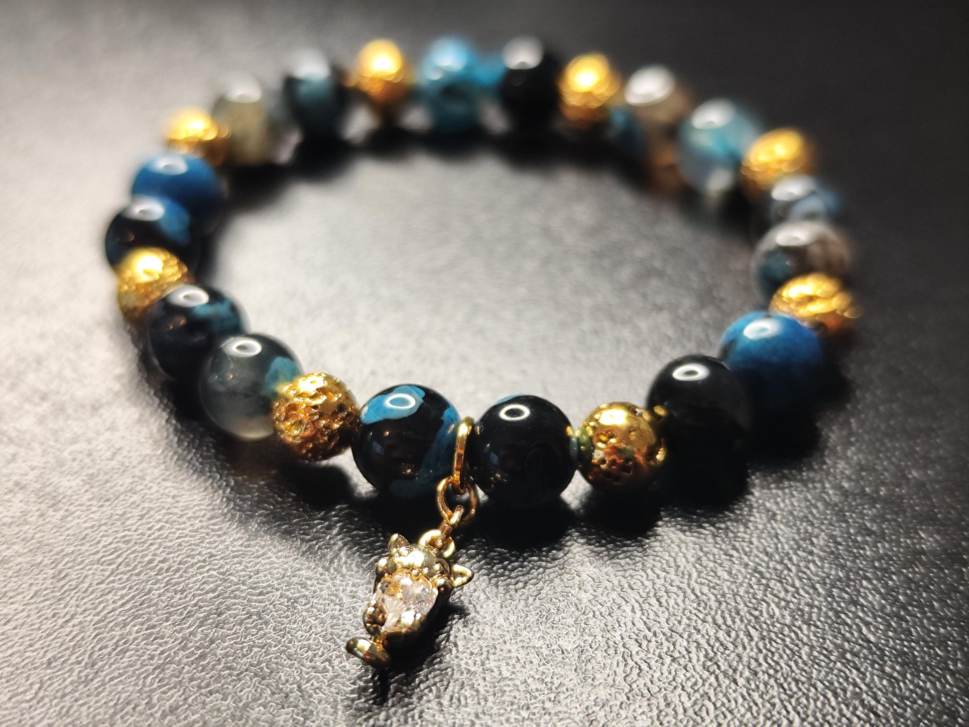 Handgemachtes Armband mit Achat-Perlen und vergoldetem Katzen-Anhänger