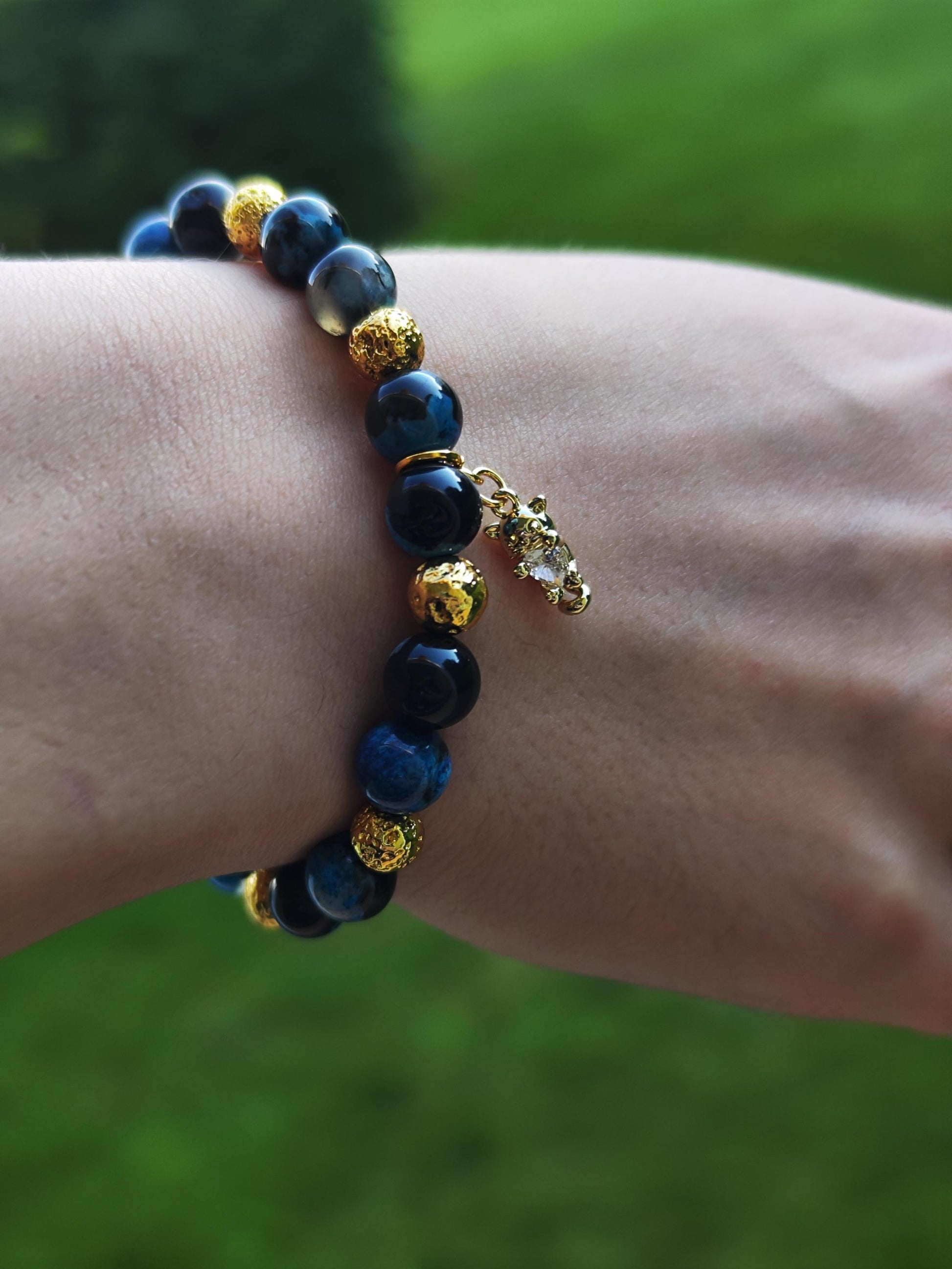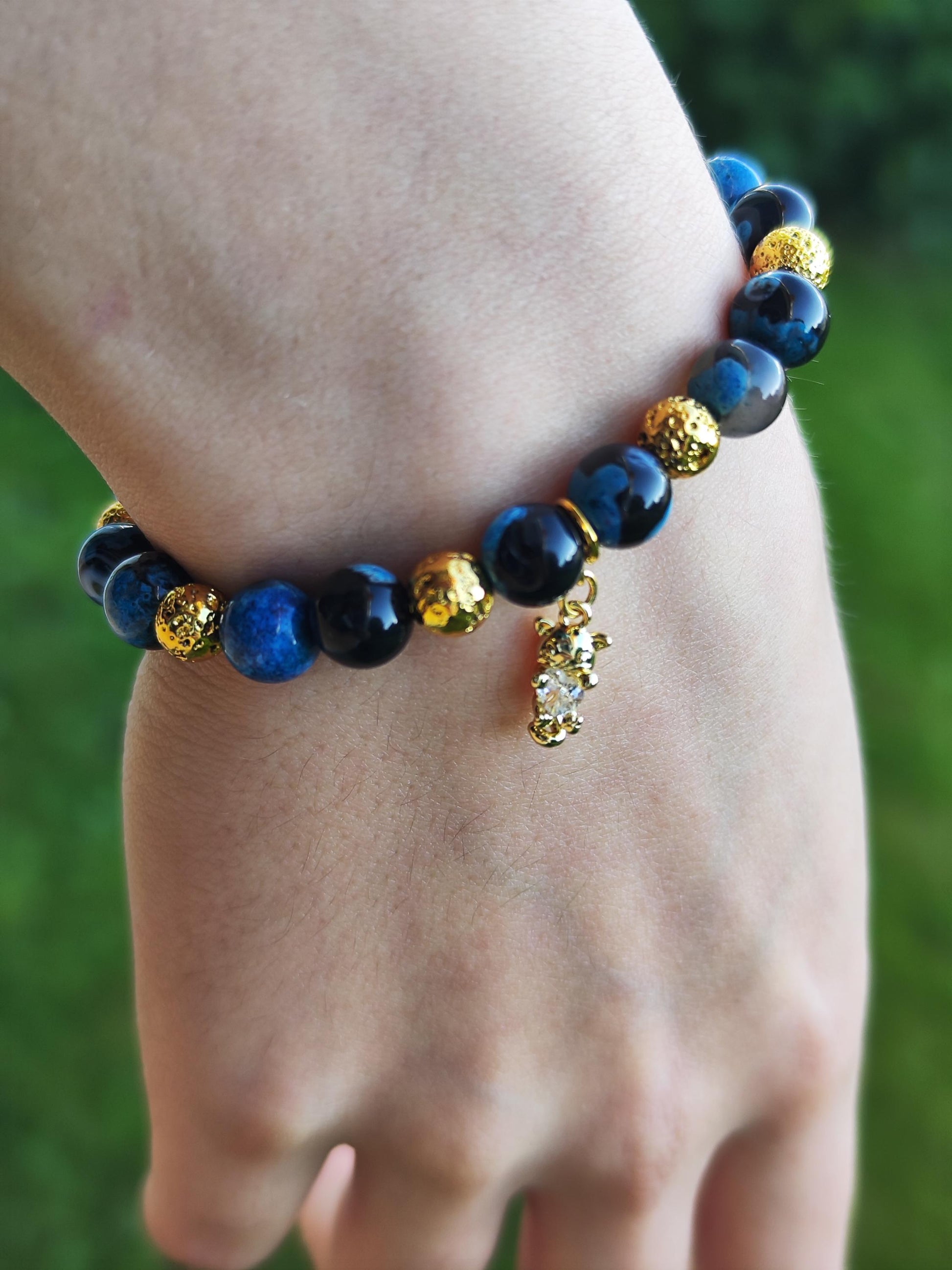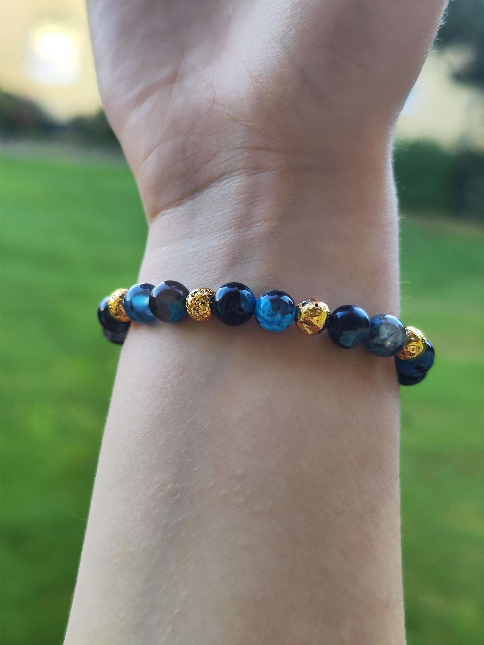 Dieses elegante Armband kombiniert die natürliche Schönheit von Achat mit luxuriösen goldfarbenen Akzenten. Die runden Achat-Perlen zeigen einzigartige Muster in Blau-, Grau- und Schwarztönen und machen jedes Stück zu einem Unikat. Zwischen den Edelsteinen setzen goldene Spacer-Perlen funkelnde Highlights.
