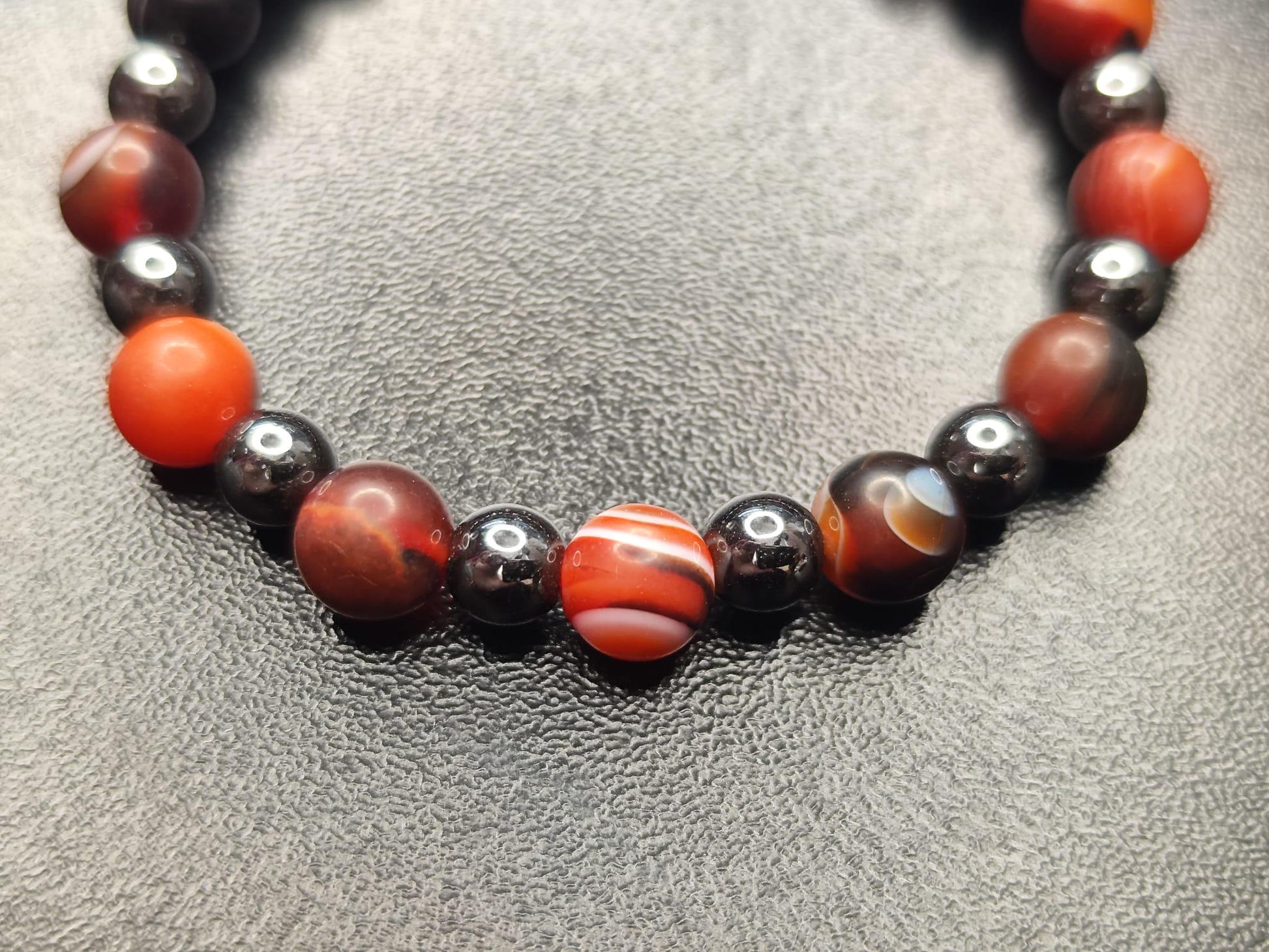 Handgemachtes Armband mit Black Gallstone und Roten Linearen Achatperlen – Edelstein Schmuck für Energie & Schutz