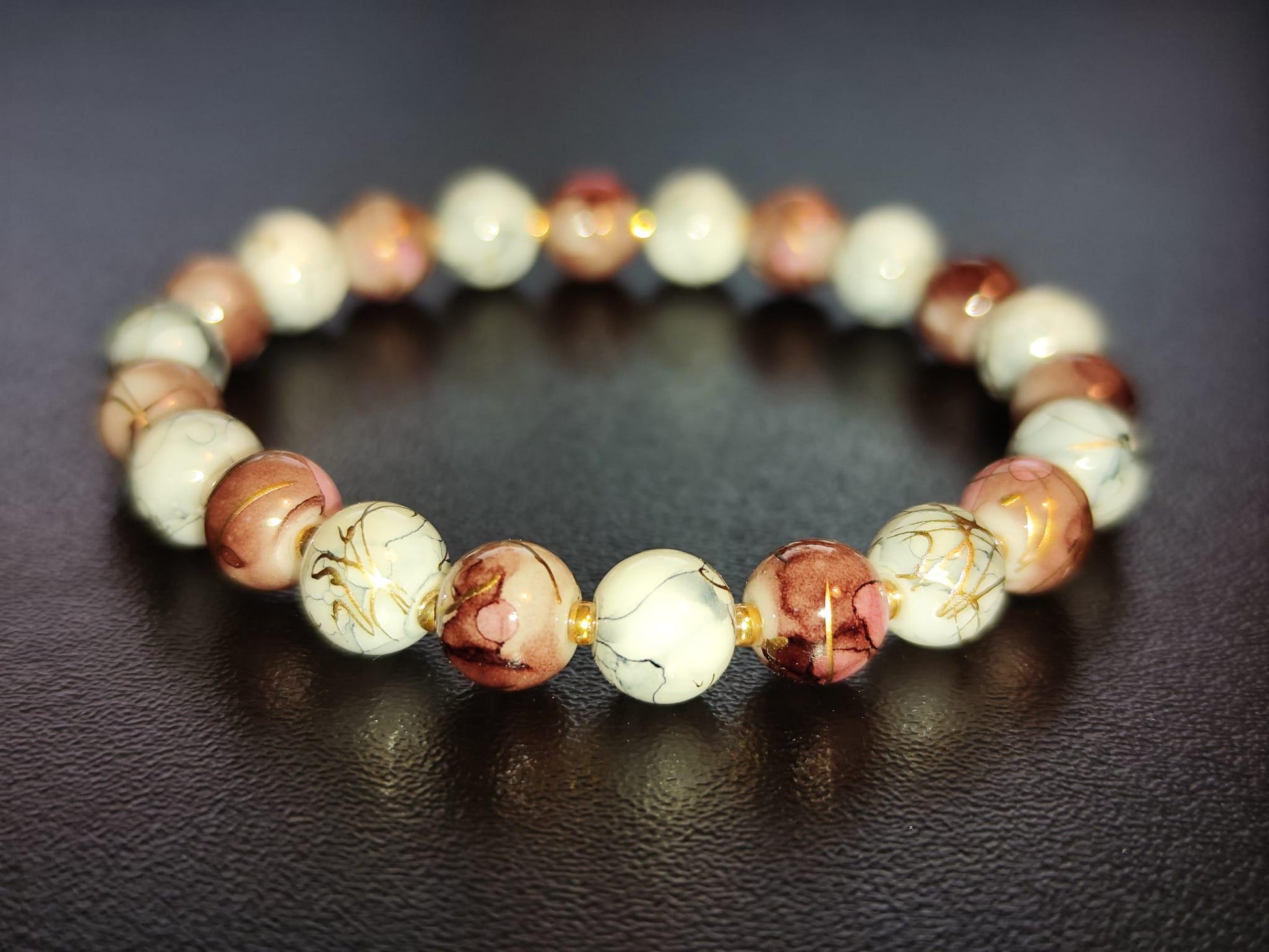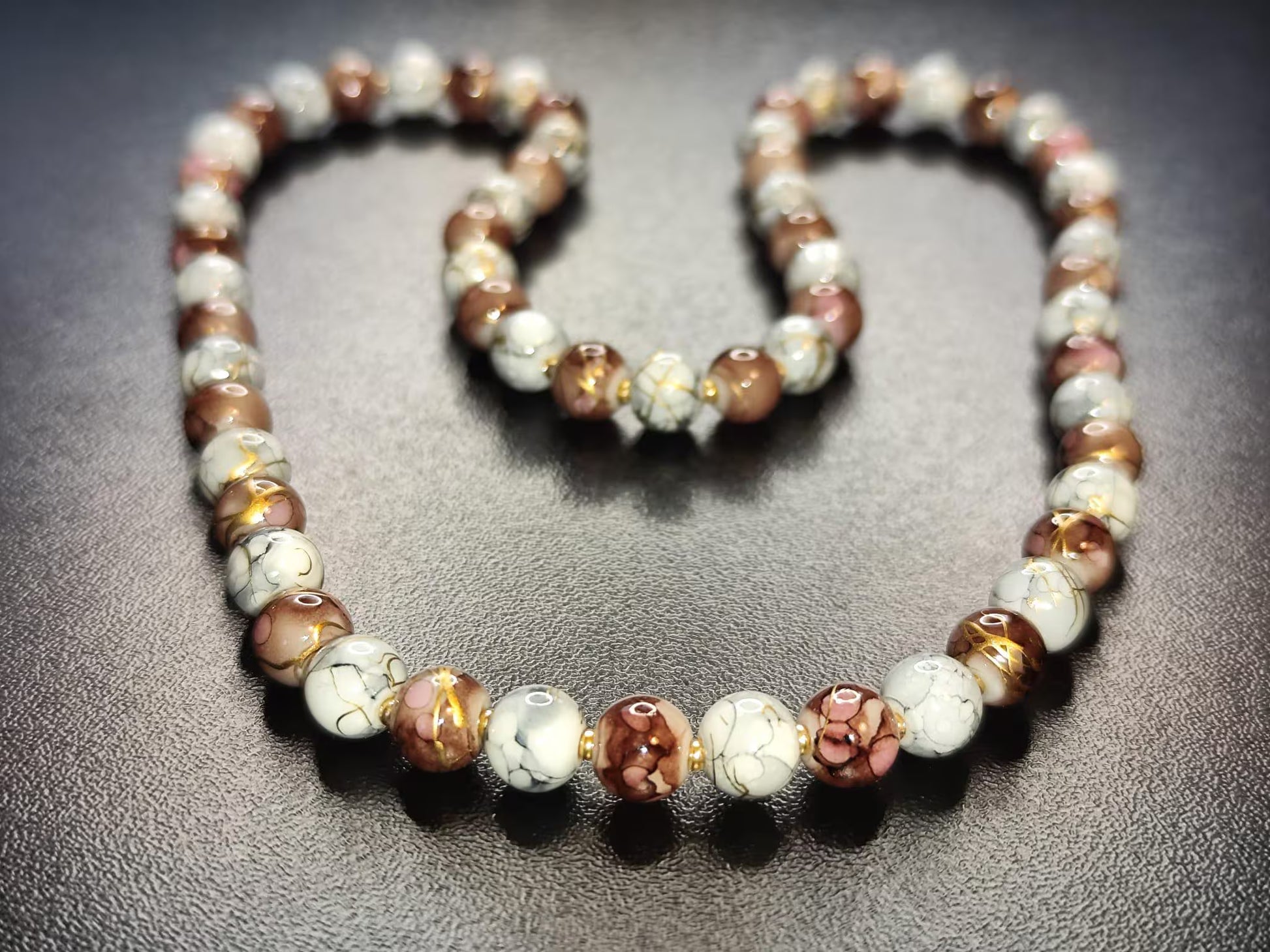 Dieses stilvolle Schmuckset besteht aus wunderschön schimmernden Glasperlen in elegantem Grau-Braun mit marmorierter Optik. Die Kombination aus glänzenden Perlen und goldfarbenen Akzenten macht dieses Set zu einem eleganten Allrounder – ideal für Alltag, Büro oder besondere Anlässe.