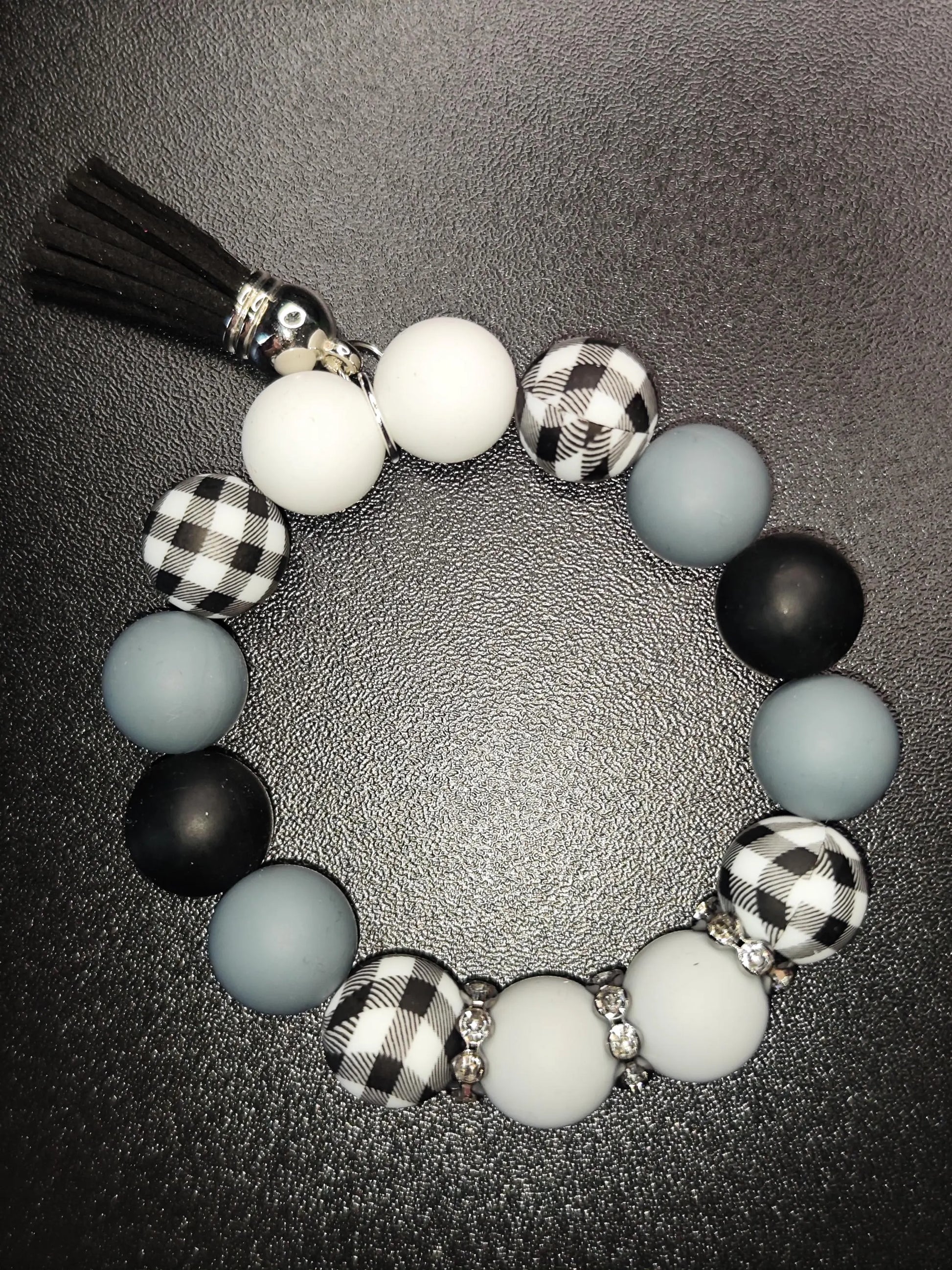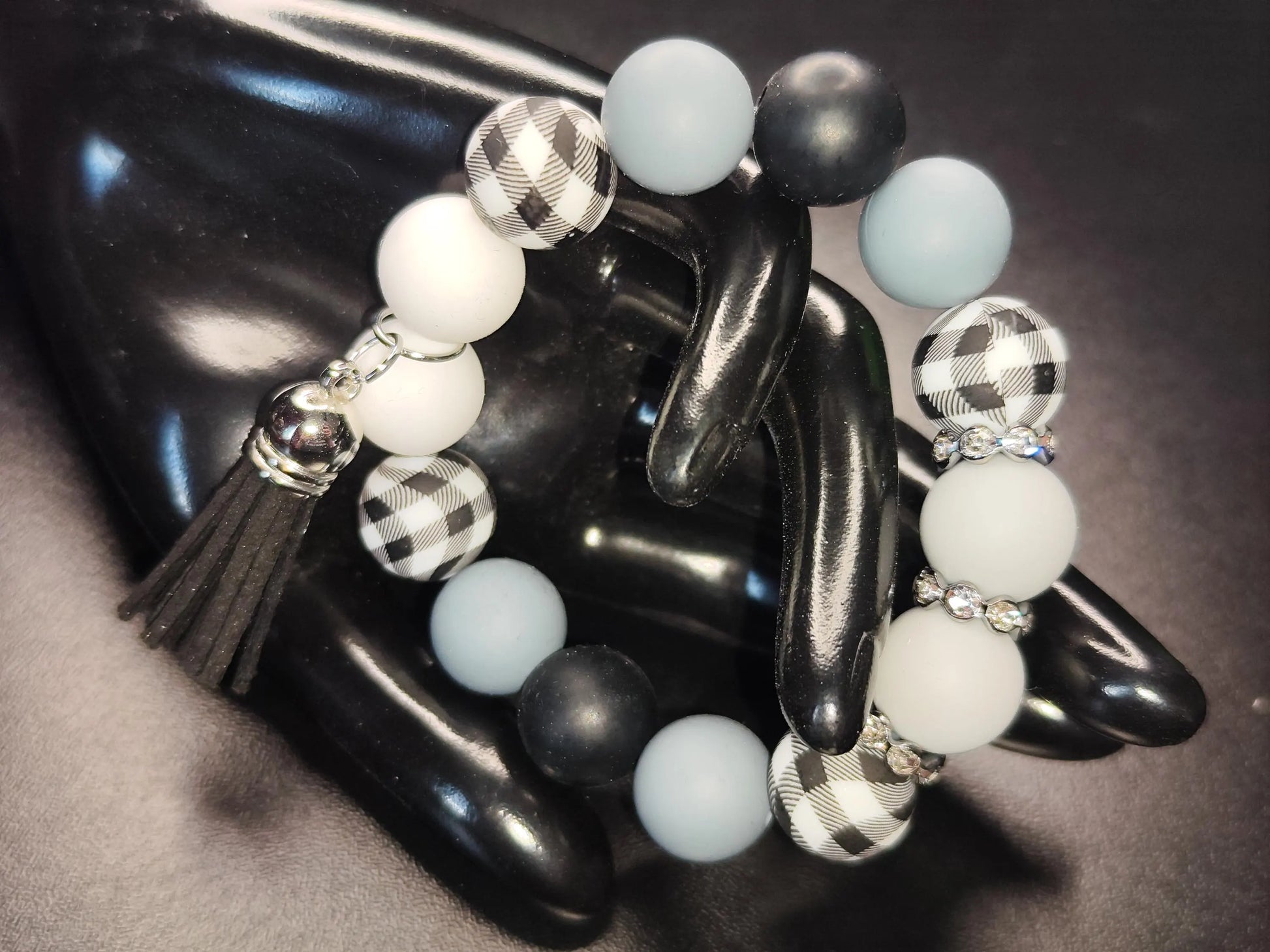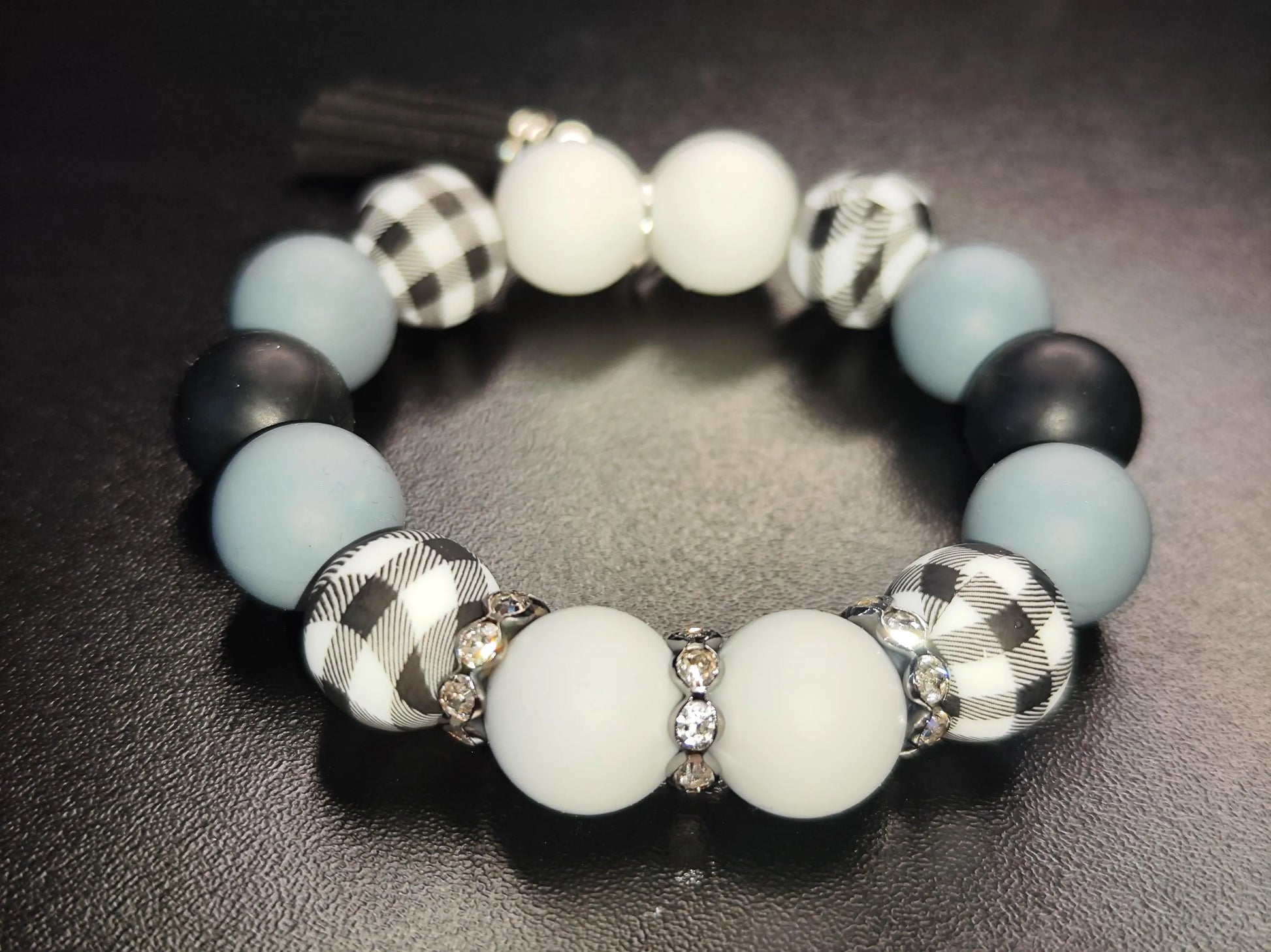 Ein stilvolles und modernes Armband aus Silikonperlen (12 mm) in Schwarz, Weiß und Grau, veredelt mit auffälligen Karomuster-Perlen und funkelnden Zwischenperlen. Das zeitlose Design passt perfekt zu klassischen Outfits und lässt sich vielseitig kombinieren.