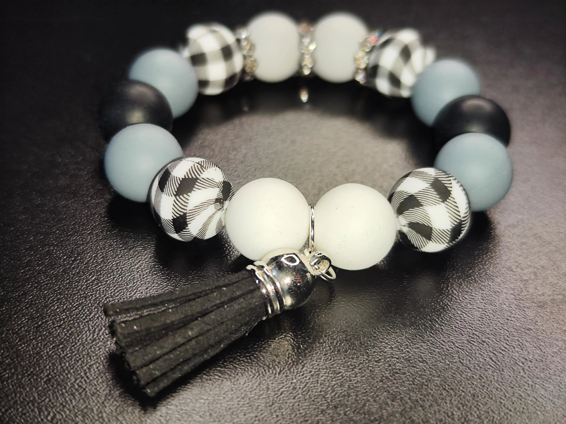 Handgemachtes Silikon Armband Damen – 16 cm Stretcharmband mit 12mm Perlen in Schwarz, Weiß & Grau, Karomuster, Geschenkidee