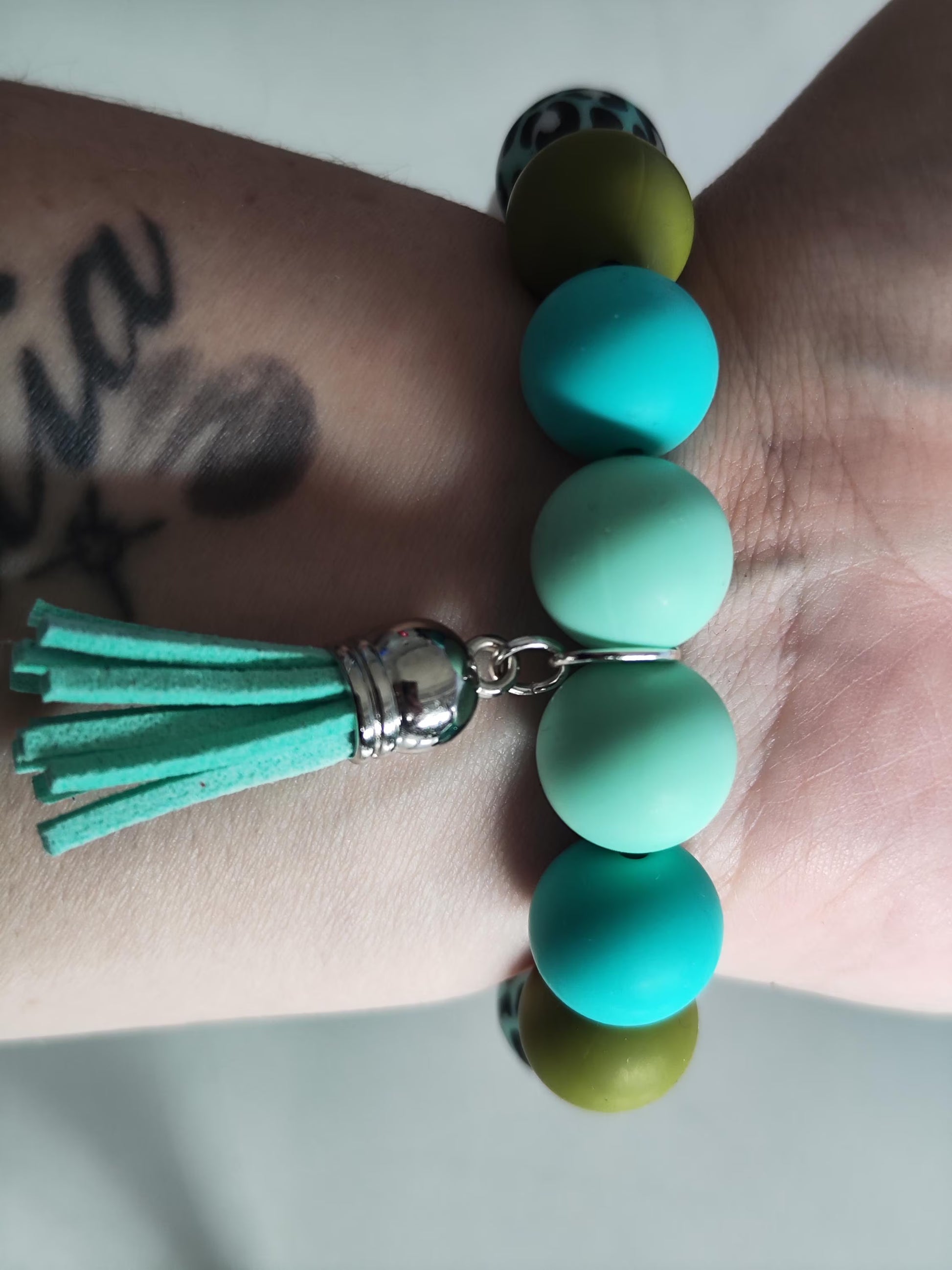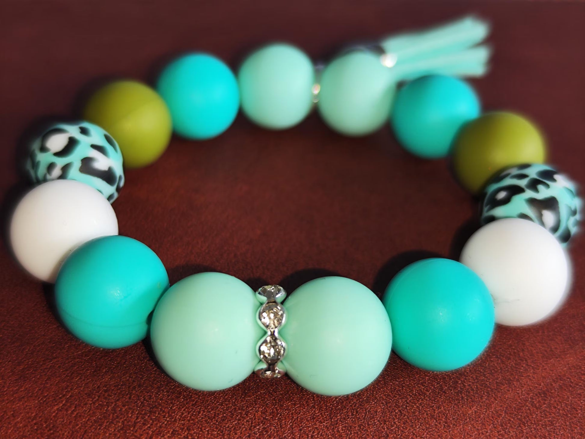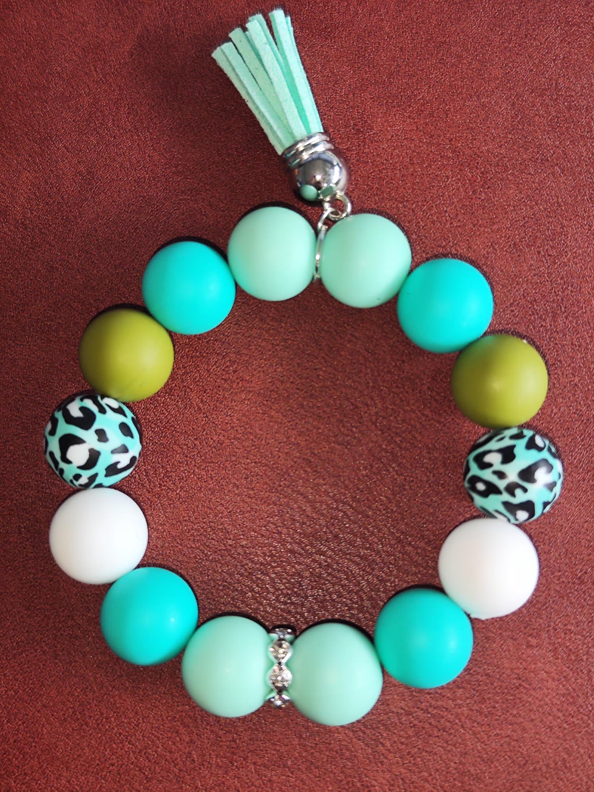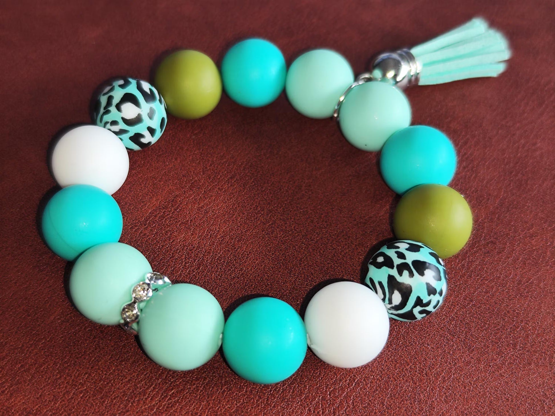 Dieses handgemachte Armband aus hochwertigen Silikonperlen (12 mm) ist ein echter Blickfang. Die frische Farbkombination aus Türkis, Mint, Weiß und den auffälligen Leopardenmuster-Perlen macht es zum perfekten Accessoire für jeden Anlass.