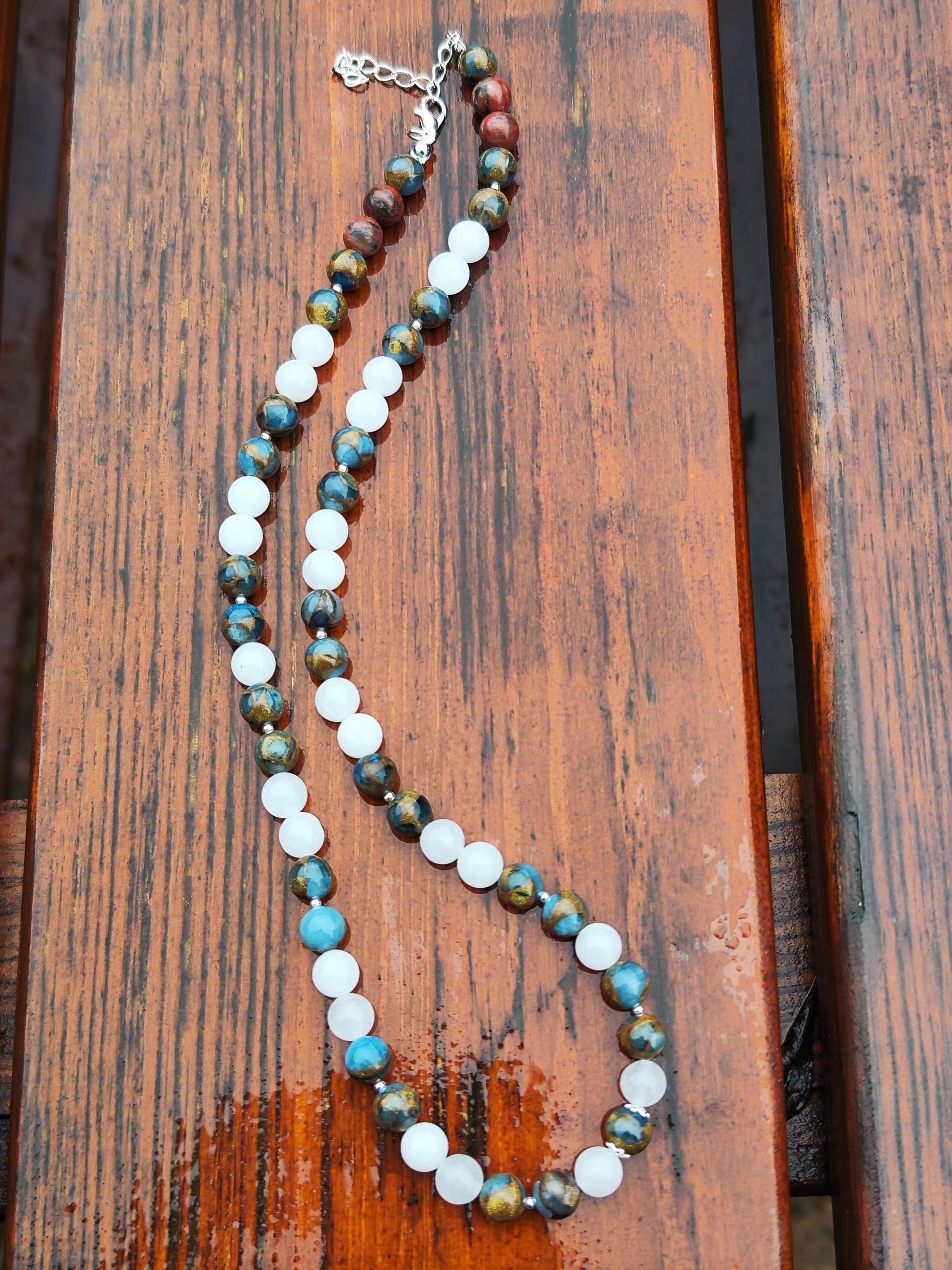 Handgemachte Edelstein-Halskette mit weißem Jade und regenbogenfarbenem Jaspis – Naturstein – Boho Schmuck