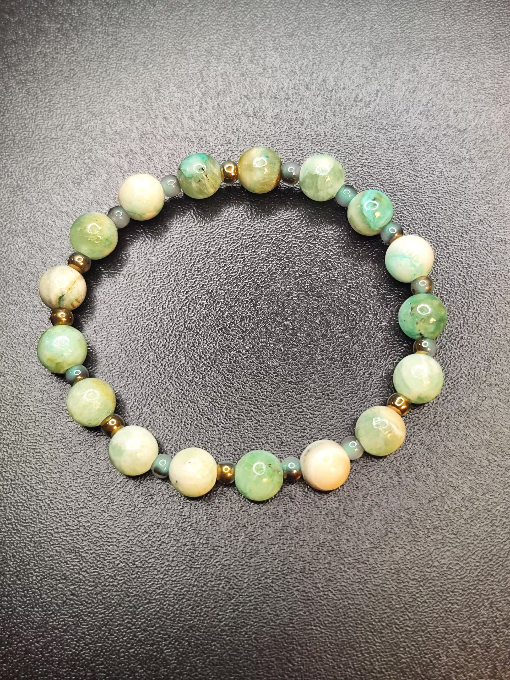 Dieses wunderschöne Armband wurde mit viel Liebe zum Detail handgefertigt und kombiniert hochwertige Phoenixstein-Perlen mit schimmernden Glasperlen in grün und Gold. Die sanften Grün- und Cremetöne des Phoenixsteins wirken beruhigend und harmonisch – perfekt für alle, die Naturverbundenheit und Eleganz zugleich schätzen.