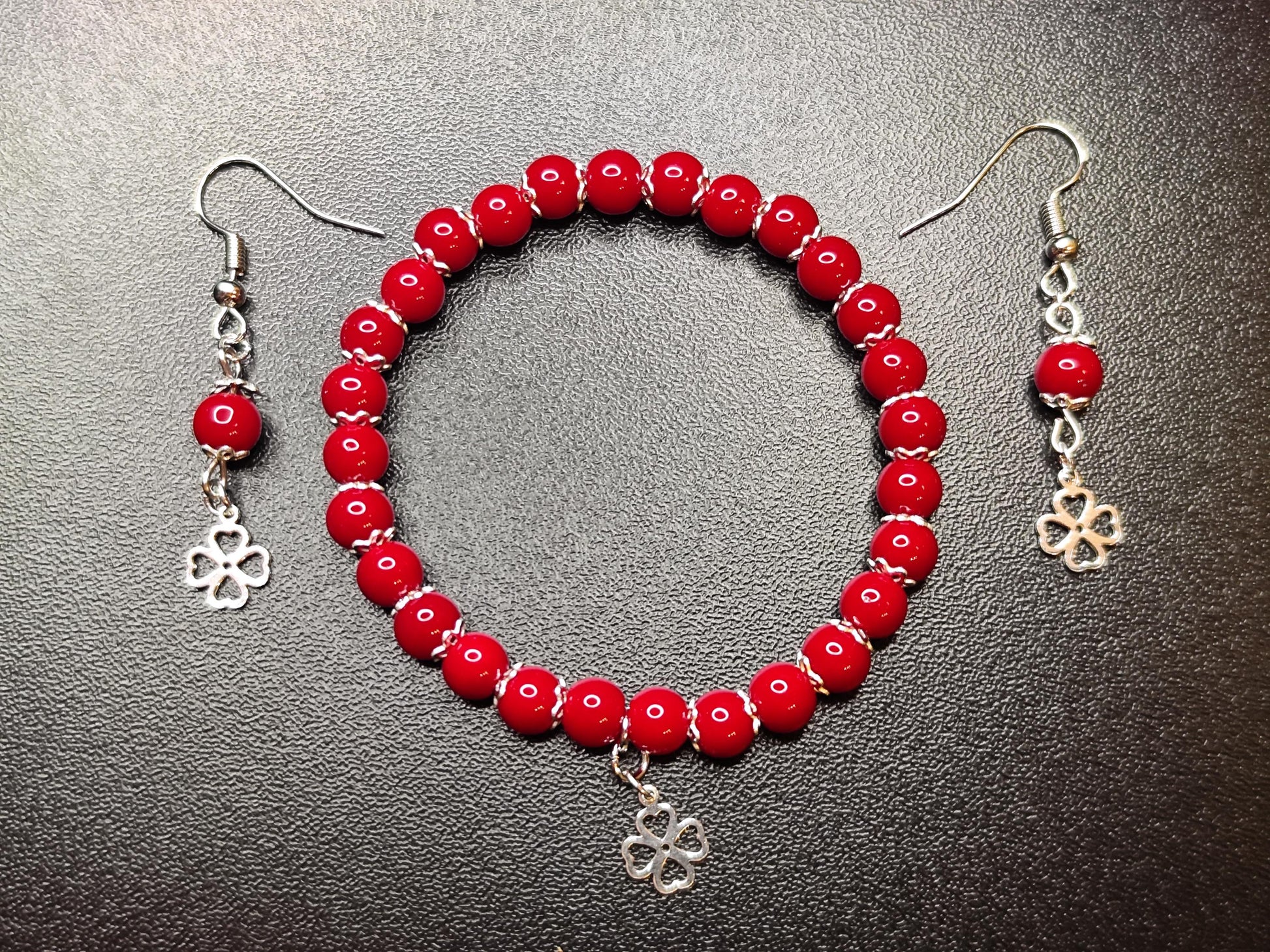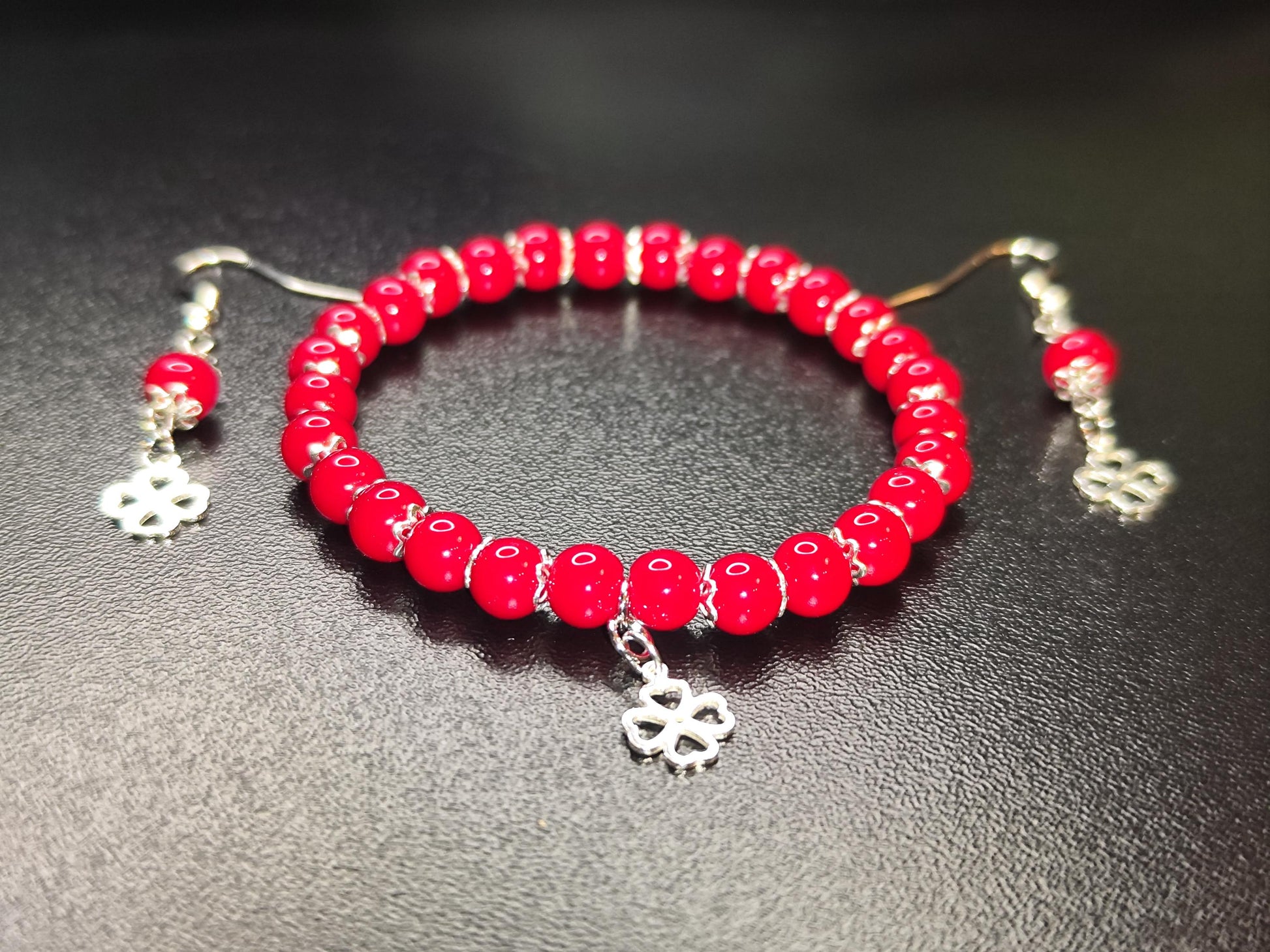 Dieses handgefertigte Schmuckset aus leuchtend roten Red Coral Edelsteinperlen und echtem 925 Sterling Silber ist ein echter Blickfang. Das Set besteht aus einem elastischen Armband und passenden Ohrhängern – beide verziert mit zarten Kleeblatt-Anhängern als Symbol für Glück.