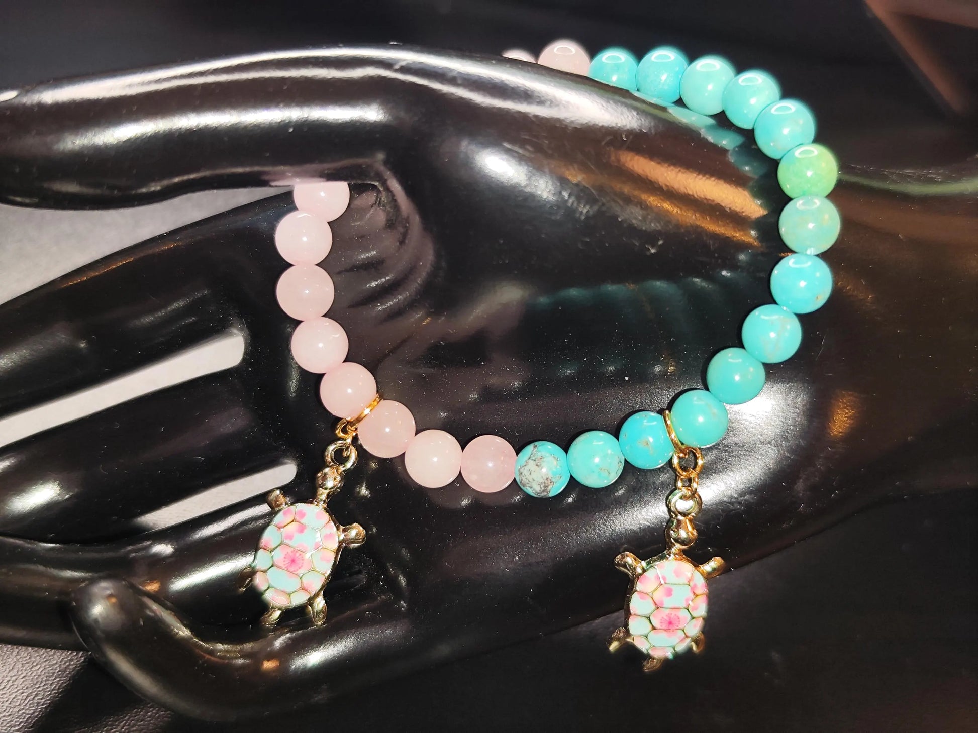 Rosenquarz & Türkis Armband mit Schildkröten Charm | Naturstein Schmuck | 6mm Edelsteinperlen