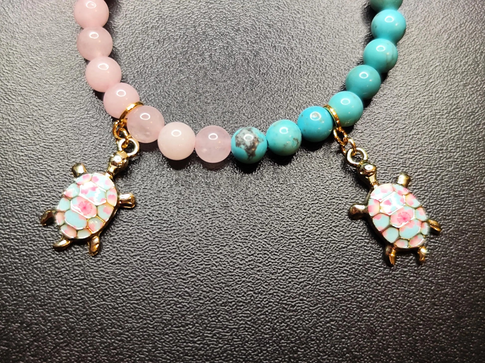 Ein verspieltes und zugleich elegantes Naturstein-Armband aus 6 mm Rosenquarz und Türkis-Perlen. Zwei farbenfrohe Schildkröten-Anhänger machen dieses Armband zu einem besonderen Blickfang.